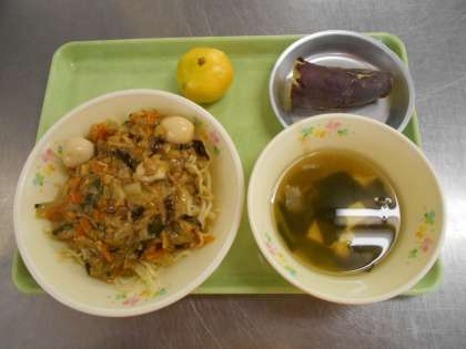 10月22日の給食 公開日 2020/10/22 更新日 2020/10/22 給食室から 今日の献立は、あんかけやきそば、わかめスープ、ふかしいも、みかん、牛乳でした。 今日のふかしいもの芋はとても大きくて…子供たちもおなかいっぱいになったようです。