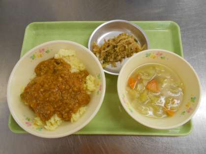今日の献立は、とまと入りドライカレー、だいこんごまサラダ、野菜のスープ煮、牛乳でした。