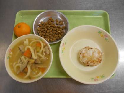 今日の献立は、ほうとううどん、じゃがもち、豆黒糖、みかん、牛乳でした。