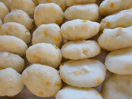 じゃがもちはじゃがいもを蒸してつぶして、コーンや牛乳と練りあわせ、油で揚げたものです。子供たちもよく食べていました。