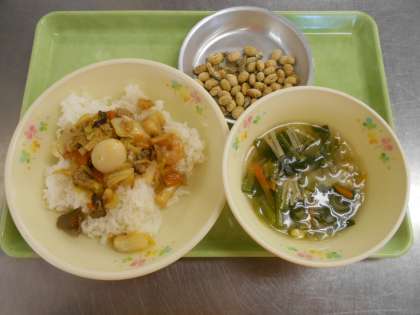 12月8日の給食 公開日 2020/12/08 更新日 2020/12/08 給食室から 今日の献立は、中華丼、小松菜とえのきのスープ、大豆といりこのごまがらめ、牛乳でした。 中華丼には様々な具材が入っていました。