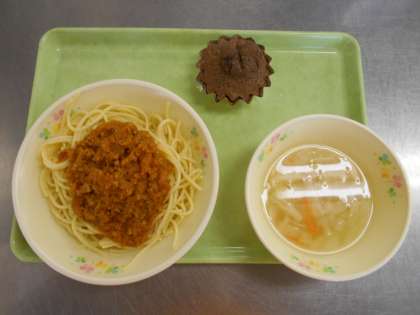2月13日の給食 公開日 2021/02/15 更新日 2021/02/15 給食室から 今日の献立は、スパゲッティミートソース、白菜スープ、チョコチップケーキ、ジョアでした。 今日は土曜参観で午後も授業があるため、給食がありました。がんばっているみなさんのために、少し特別な給食にしました。よく食べていました。
