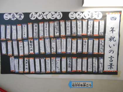 来月の今日は、卒業式 公開日 2021/02/24 更新日 2021/02/24 今日の出来事 6年生へ、在校生から心のこもったメッセージが西階段に掲示されています。4年生はミニ書初め風に、3年生は宇宙の星とロケットに、とちのみは木と花に。 上から4年生、3年生、とちのみの順です。 校長より 授業 研究・研修 生活 行事 給食