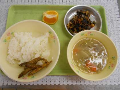 今日の献立は、ごはん、わかさぎ甘酢、ひじきの煮物、豚汁、いよかん、牛乳でした。