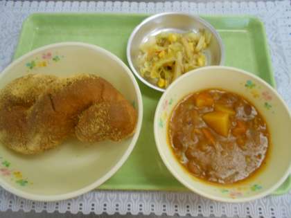 今日の献立は、きなこ揚げパン、金時豆のシチュー、じゃこサラダ、牛乳でした。
