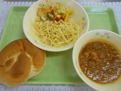 3月9日の給食 公開日 2021/03/09 更新日 2021/03/09 給食室から 今日の献立は、ミルクパン、カチャトーラ、ペペロンチーノ、イタリアンサラダ、牛乳でした。 今日はイタリア・ローマ料理でした。カチャトーラは「鶏の狩人風」という意味で、鶏肉をトマトで煮込んだ料理です。イタリアンサラダにはバジルも使いました。今日は1年生が給食を見た瞬間に「やったー!」とジャンプしてよろこんでいました。よく食べていました。