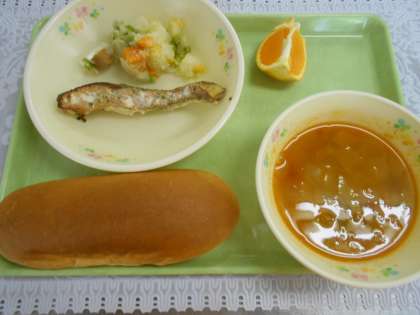 今日の献立は、ミルクパン、さけのハーブ焼き、ピッティパンナ、豆のスープ、清見オレンジ、牛乳でした。