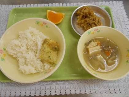今日の給食は、ごはん、いかのねぎ塩焼き、田舎汁、切り干し大根の煮物、きよみオレンジ、牛乳でした。
