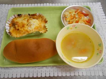 今日の献立は、ミルクパン、ムサカ、ファソラーダ、サラダ・ポリティキ、牛乳でした。