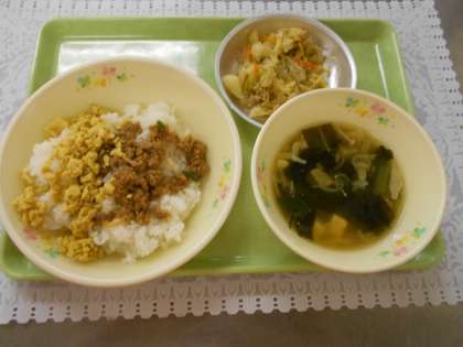 5月28日の給食 公開日 2021/05/28 更新日 2021/05/28 給食室から 今日の献立は、二色丼、キャベツのごまじゃこあえ、ゆばのすまし汁、牛乳でした。 二色丼は肉そぼろと炒り卵でした。すまし汁はこんぶとさば厚けずり節からだしをとりました。そぼろごはんは、子供達も大好きですね。
