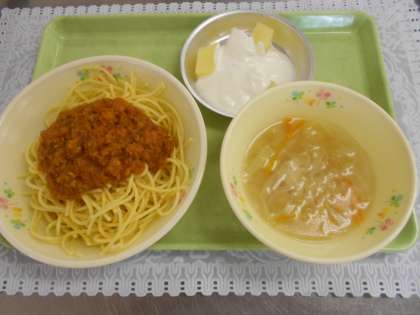 6月2日の給食 公開日 2021/06/02 更新日 2021/06/02 給食室から 今日の献立は、スパゲッティミートソース、ジュリエンヌスープ、フルーツヨーグルト、牛乳でした。 今日は子供達が大好きなメニューでした。1年生も、たくさん食べていました。