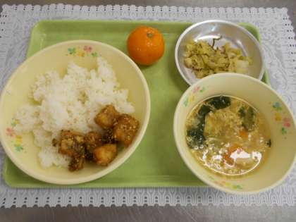 6月3日の給食 公開日 2021/06/03 更新日 2021/06/03 給食室から 今日の献立は、ごはん、ホキのごまがらめ、かきたま汁、じゃこキャベツ、冷凍みかん、牛乳でした。 ホキのごまがらめは、にんにく、しょうが、しょうゆなどで下味をつけたホキに米粉をまぶして油で揚げたものです。こどもたちの人気メニューです。今日は暑かったので、冷凍みかんに大喜びでした。