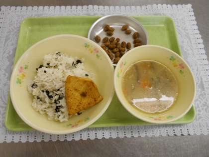今日の献立は、かみかみごはん、いかの松かさ焼き、豚汁、豆黒糖、牛乳でした。