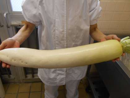 今日から1週間は、歯と口の衛生週間です。よくかんで食べると、いいことがたくさんあります。また、今日使った大根はとても大きかったです。