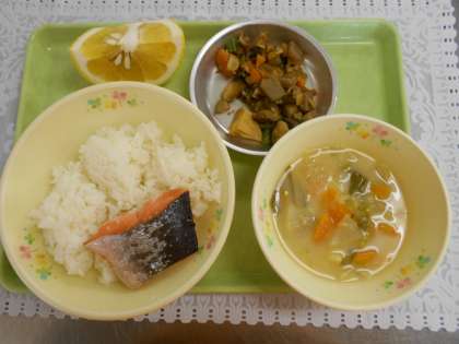 今日の献立は、ごはん、さけの塩焼き、筑前煮、呉汁、美生柑、牛乳でした。