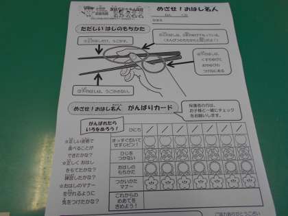 ご家庭では今日から1週間、「おはし名人がんばりカード」を使ってはしの持ち方の練習をします。ご理解・ご協力のほど、よろしくお願いいたします。