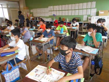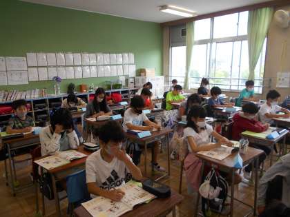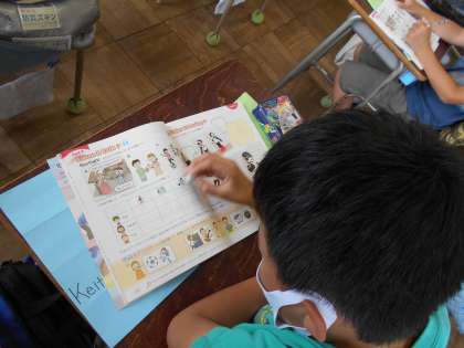 1校時、5年1組外国語。リスニングの練習中。Can you〜?の質問に、教科書の3人の人物がそれぞれテニスや水泳ができると言っているのかできないと言っているのかを聞き取っています。