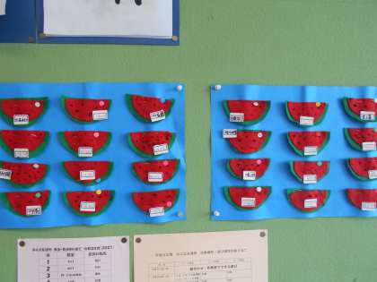 2組の教室の背面には家庭科の裁縫の練習で作ったフェルトのスイカが飾ってあり、夏の季節感を感じさせています。