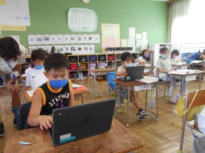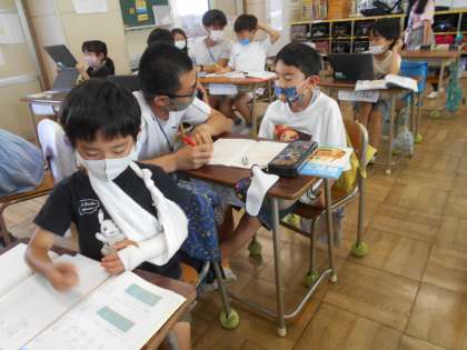 3校時、2年1組の算数。くり上がり、くり下がりで苦戦中。サポーターの斎藤さんに校長も加わって教えました。課題が早く終わった子から学習端末を持ってきてドリルコンテンツの「ミライシード」で基礎基本を徹底。学習履歴を見ると、6月だけで4時間以上取り組んでいる子もいます。