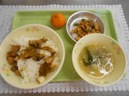 6月17日の給食 公開日 2021/06/17 更新日 2021/06/17 給食室から 今日の献立は、焼き鳥丼、五目煮豆、小松菜のみそ汁、冷凍みかん、牛乳でした。 今日ははし名人になろう3日目、豆をつまむ練習の献立でした。 1年生も豆をがんばってつまんでいました。