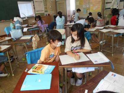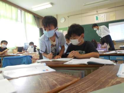 3校時、2年2組の算数。復習の問題をグループになって解いています。分からないところは友達に聞いて「あっ、そうか〜」「なるほど〜」。教えた子はますます定着が進みます。
