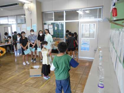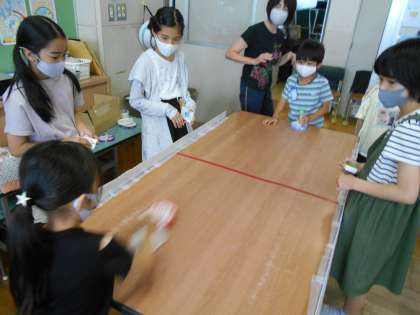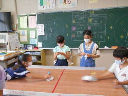 4年1組は「ストライクホッケー」教室の前の方でホッケー、後ろでストラックアウトに挑戦。