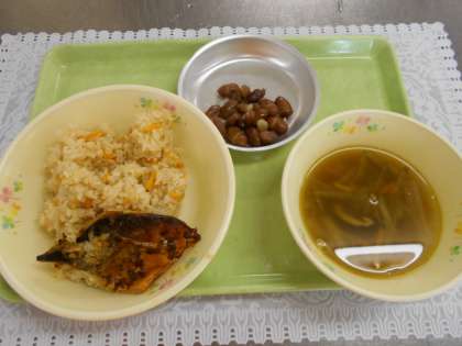 今日の献立は、にんじんごはん、さばのねぎ塩焼き、金時豆の甘煮、沢煮椀、牛乳でした。
