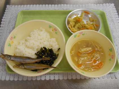 ししゃもは好きな子と苦手な子とはっきり分かれる食べ物です。給食では焼いたものが出ることが多いですが、片栗粉をまぶして唐揚げにするとより食べやすくなります。わかめのにんにく炒めは人気のあるメニューです。気持ち濃いめに味をつけた味噌汁もあってか、ごはんの残量が比較的少なかったです。