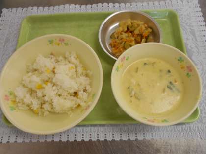 今日の献立は、コーンピラフ、まめサラダ、パンプキンシチュー、牛乳でした。