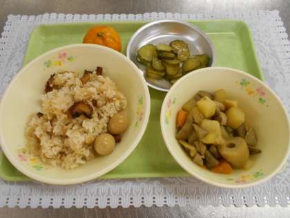 今日の献立は、たこめし、うずら卵のからめ煮、筑前煮、スタミナきゅうり、牛乳でした。
