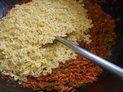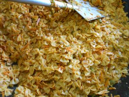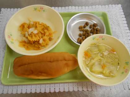 今日ははちナポサンドでした。今年のはちナポは料理人の方直伝のレシピでした。八王子産の夏野菜を使い、パンにはさみやすいファルファッレ(リボンパスタ)で、隠し味にみそを使いました。本場のはちナポは生のたまねぎがたっぷりかかっているのが特徴ですが、給食ではにんにく、オリーブオイルとともに炒めたたまねぎを上からかけました。