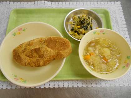 7月9日の給食 公開日 2021/07/09 更新日 2021/07/09 給食室から 今日の献立は、きなこ揚げパン、野菜のスープ煮、わかめとじゃこのサラダ、牛乳でした。 今日は子供たちに大人気の揚げパンです。何日も前から楽しみにしていたという子が何人もいました。1年生は揚げパンになじみのない子も多いのか、「きなこのかかったパン?」と首をかしげる子もありました。しかし、片付けの時には「おいしかった!」と多くの1年生から声をかけてもらいました。