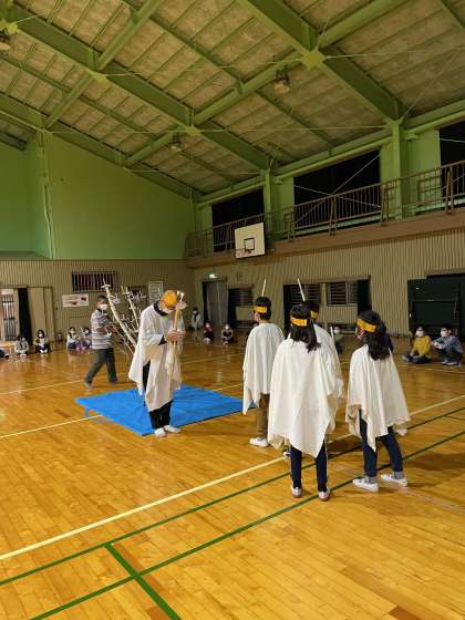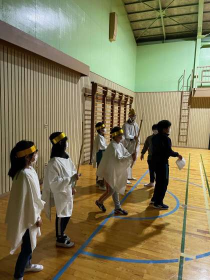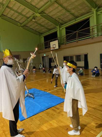 夜のメインイベント、キャンプファイヤーは、体育館でのキャンドルファイヤーに。