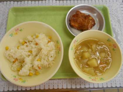 今日の献立は、コーンピラフ、バーベキュードチキン、野菜のスープ煮、牛乳でした。