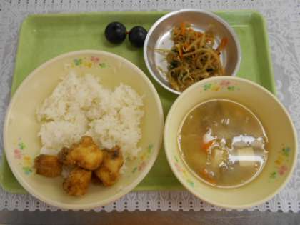 9月30日の給食 公開日 2021/09/30 更新日 2021/09/30 給食室から 今日の献立は、ごはん、白身魚の香り揚げ、青菜の和え物、豚汁、ぶどう、牛乳でした。 明日から10月となり、夕焼けチャイムの時間も変わりますね。給食では秋の味覚がおいしい季節になりましたので、積極的に使っていきたいと思います。今日のフルーツはぶどうでした。子供たちも朝から楽しみにしていました。