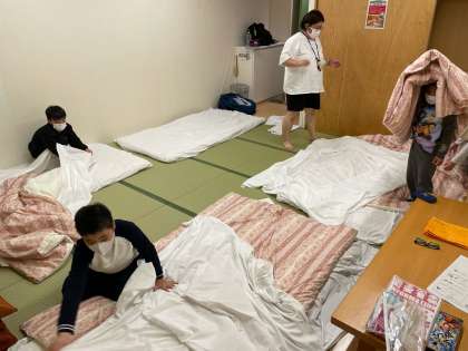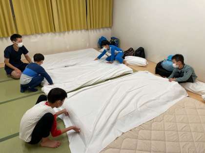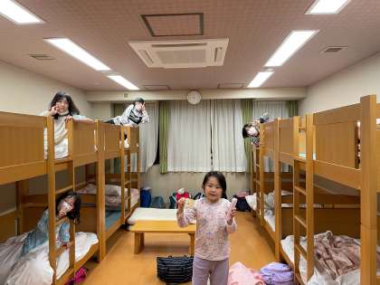 就寝準備。女の子は二段ベットで余裕しゃくしゃく。男の子はシーツ、布団カバーに悪戦苦闘。「眠れそうにないや〜」弱気な声が聞こえてきます…。