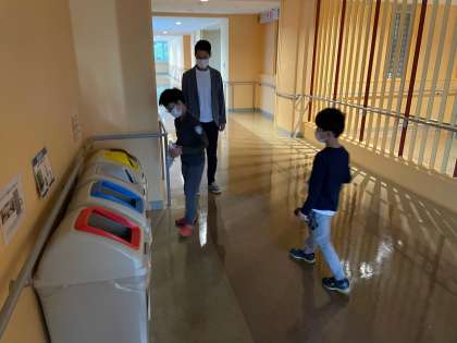 布団をたたみ、部屋の片付け、ゴミ捨てをして今日の準備。