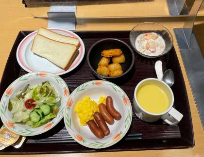 朝食。食事は温かく、ボリュームもあり美味しいです。食べきれなさそうな人は、箸をつける前に申告して減らしてもらいます。