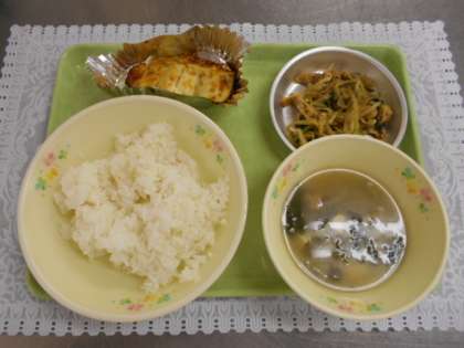 今日の献立は、ごはん、夕焼小焼やき、小松菜ともやしの煮浸し、みそけんちん、牛乳でした。
