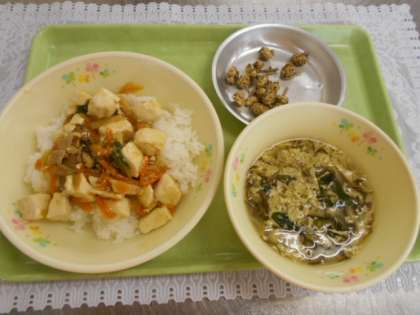 今日の献立は四川豆腐丼、小魚と大豆のごまがらめ、もずくとたまごのスープ、牛乳でした。