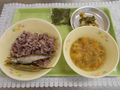 今日の献立は、古代ごはん、焼きししゃも、ほうれんそうの磯和え、じゃがいものそぼろ煮、牛乳でした。