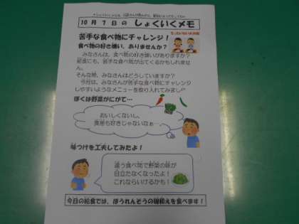 今月はもったいない大作戦ということで、市内の小中学校で様々な取組がなされています。愛宕小ではその一環として、「苦手な食べ物にチャレンジ!」メニューが登場します。愛宕小では野菜や魚が苦手な子が多いです。そこで、それらを食べやすい味付けや料理形態にして提供し、食べたらどんないいことがあるかを紹介することで、苦手な食べ物にチャレンジするきっかけ作りをすることにしました。