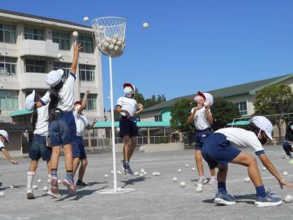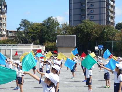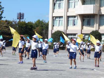 1・2年生「レッツ・トライ・フラッグ」 公開日 2021/10/11 更新日 2021/10/11 今日の出来事 今日は、旗を持って、踊りました。 初めて本番用の旗を持ち、みんな嬉しそうでした。 旗を上げ下げする時に、バサッといい音がします。 いい音がそろうように、曲をよく聞いたり、腕をしっかり伸ばしたりする姿が見られました。 玉入れ「ポケモン、ゲットだぜ!」 今日は、白組が圧勝でしたが、本番はどうなるでしょう・・・お楽しみに。 校長より 1年 2年 授業 研究・研修 生活 行事 給食