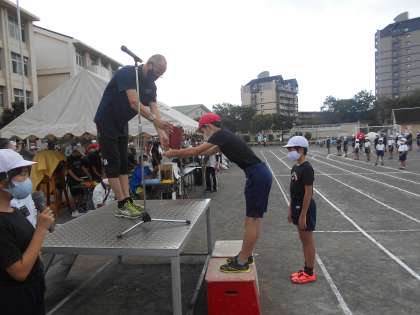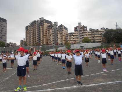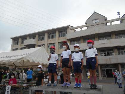 小雨が降ったりやんだりのお天気の中、1年生4人の代表のみなさんの言葉から運動会が始まりました。