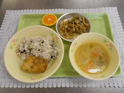 今日の献立は、かみかみごはん、いかのねぎ塩焼き、彩り和え、呉汁、菊花みかん、牛乳でした。