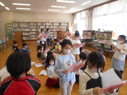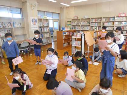 2年生は「ないた赤おに」です。3校時に図書館に集まって、台本を確認しながらそれぞれ分担個所を読み上げています。感情をこめて読める子が増えています。
