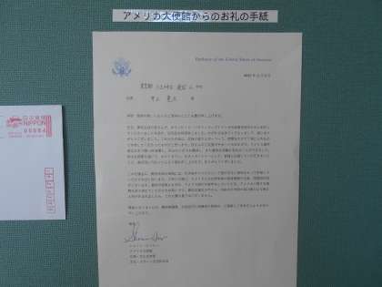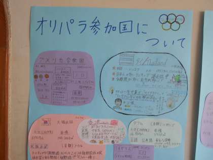 アメリカから 公開日 2021/11/11 更新日 2021/11/11 今日の出来事 アメリカ大使館から、オリパラ教育のまとめてとして選手団に送った千羽鶴に対してお礼の手紙がきました。お昼の放送で紹介しました。 廊下には調べ学習の成果が掲示してあります。これは6年生です。 校長より 授業 研究・研修 生活 行事 給食