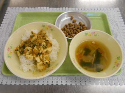 11月12日の給食 公開日 2021/11/12 更新日 2021/11/12 給食室から 今日の献立は、マーボー丼、えのきと小松菜のスープ、豆黒糖、牛乳でした。 今日は子供たちから人気のあるマーボー丼でした。 給食のサンプルケースは階段の踊り場のすぐ横にあるので、移動教室からクラスへ戻る途中、チラッとサンプルケースをのぞいてから行く子が多いです。今日はのぞいた後、「よっしゃー!」とガッツポーズをしていく子が何人もあり、見ていて楽しかったです。