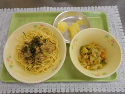 今日の献立は、はち大根おろしスパゲッティー、温野菜のごまドレッシング、りんご缶、牛乳でした。