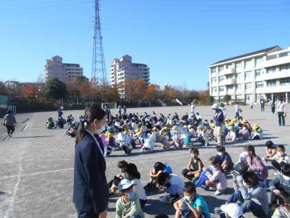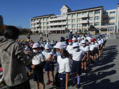 中休み、職員室から出火した想定で避難訓練がありました。校舎内にいた児童は、放送のをよく聞いて、出火先から離れた安全な経路を自分で判断して校庭へ避難しました。